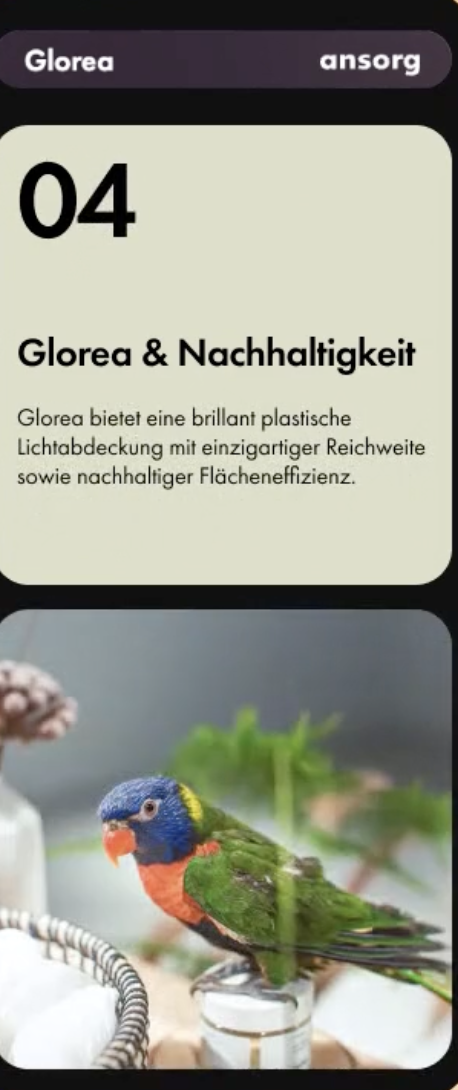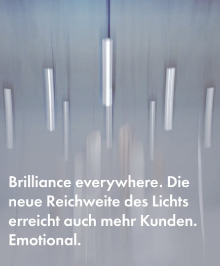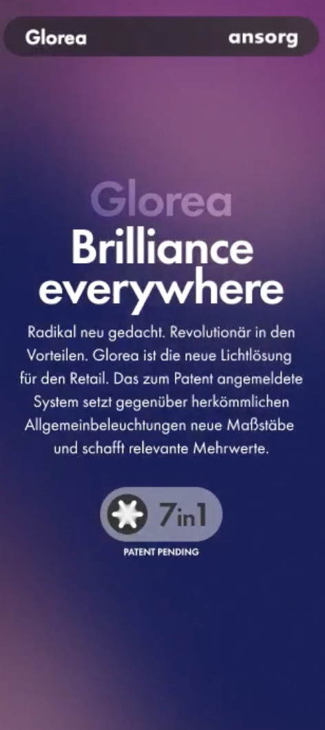 Das Leuchtenkonzept GLOREA des Herstellers Ansorg ist speziell für zeitgemäße Beleichtung im Handel ausgerichtet. Für den Launch wurde ein Gesamtkonzept mit argumentativ starker und emotional berührender Umsetzung erarbeitet. Die Website ist hier zu sehen: https://www.brilliance-everywhere.com/